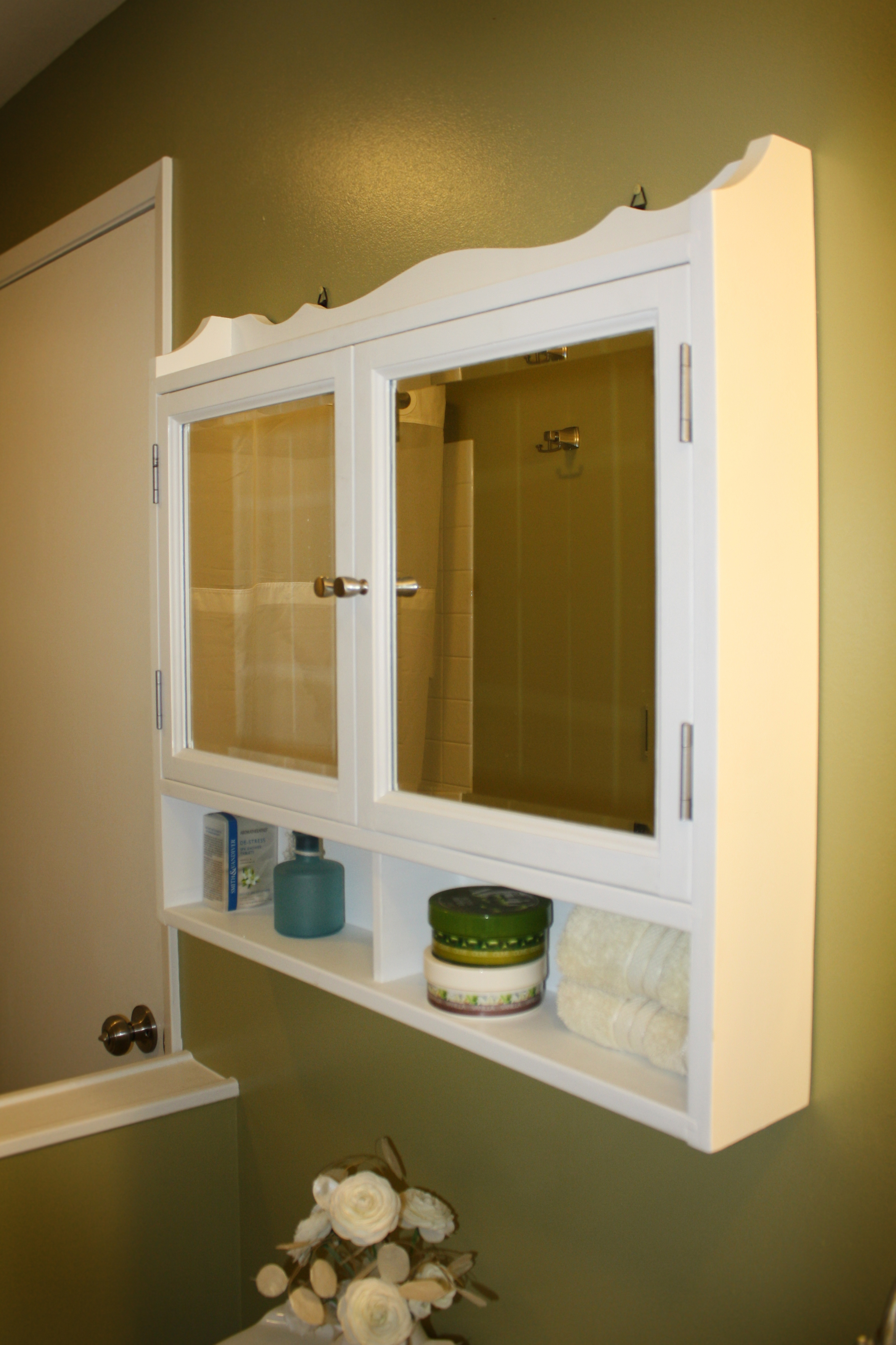 As the finishing touches were being added to the main bathroom, I felt like the medicine cabinet needing some major work. It just really screamed 80’s!! Which of course, did not work with the new crisp green and white theme. And if you’re wondering how outdated this room was, I’ll paint a picture for you….