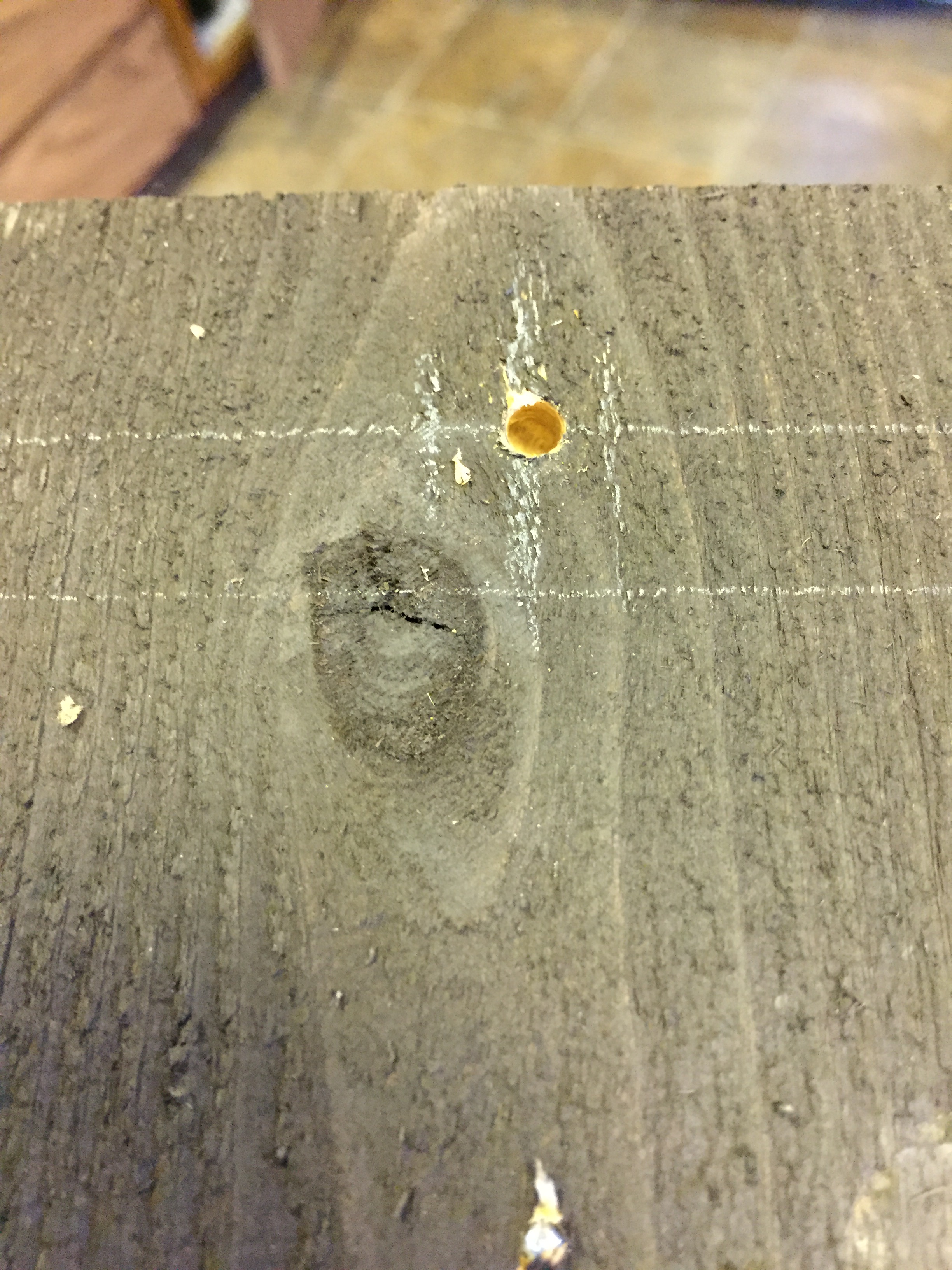 At an upward angle, drill into the wood. STOP BEFORE YOU GET TO THE TAPE!