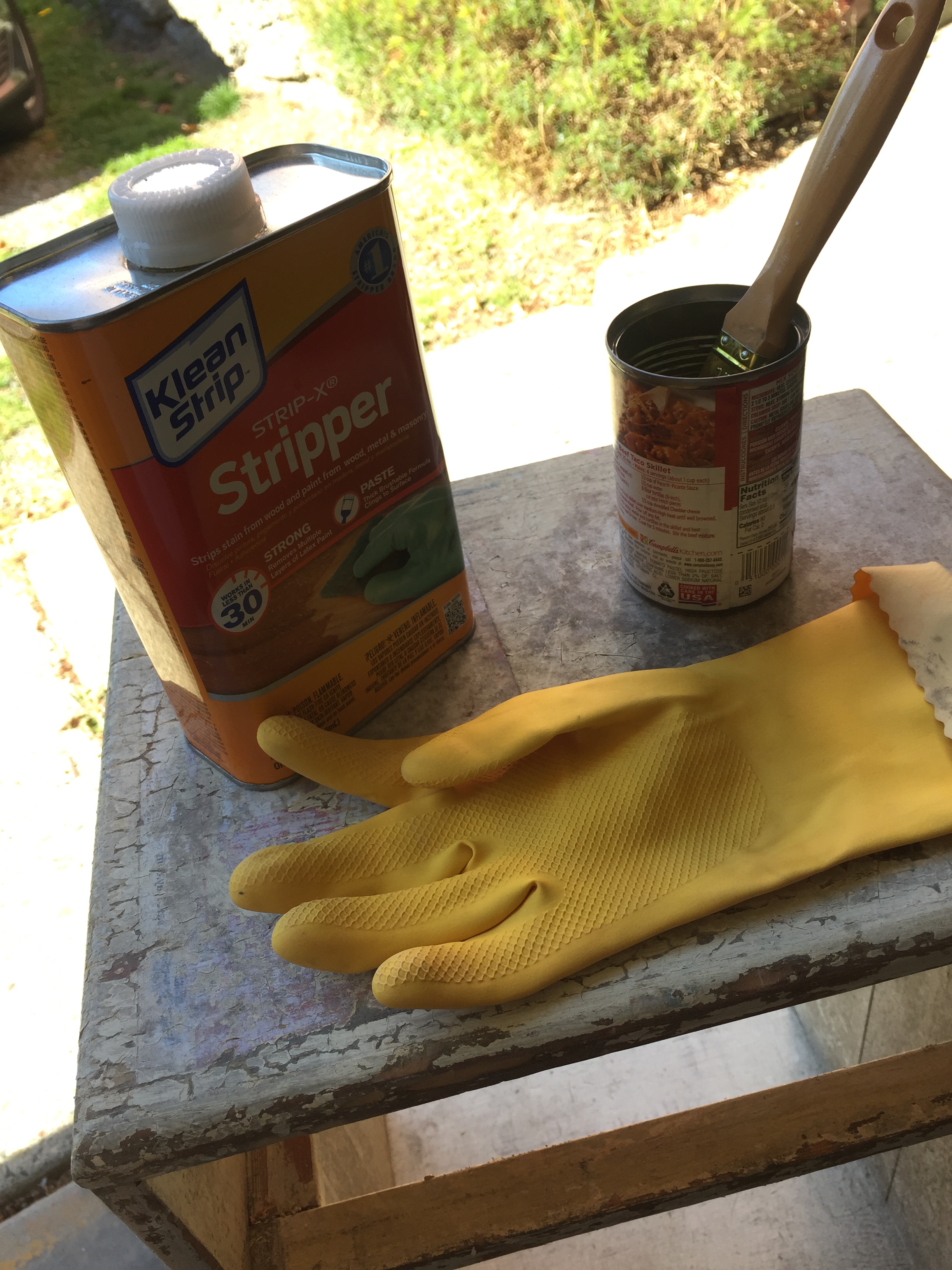 At first, I wasn’t quite sure what direction I wanted to take this nightstand. But, I did know that I wanted to strip the paint from the top, and give it a nice stain. And I won’t lie to you…stripping paint takes a lot of work. For this process, you’ll need some chemical resistant gloves, paint stripper, a paint brush, and a metal can to hold the product you’re using. Cover the entire surface with the paint stripper. Let it sit for 30 minuets. DO NOT LET THIS CHEMICAL TOUCH YOUR SKIN.