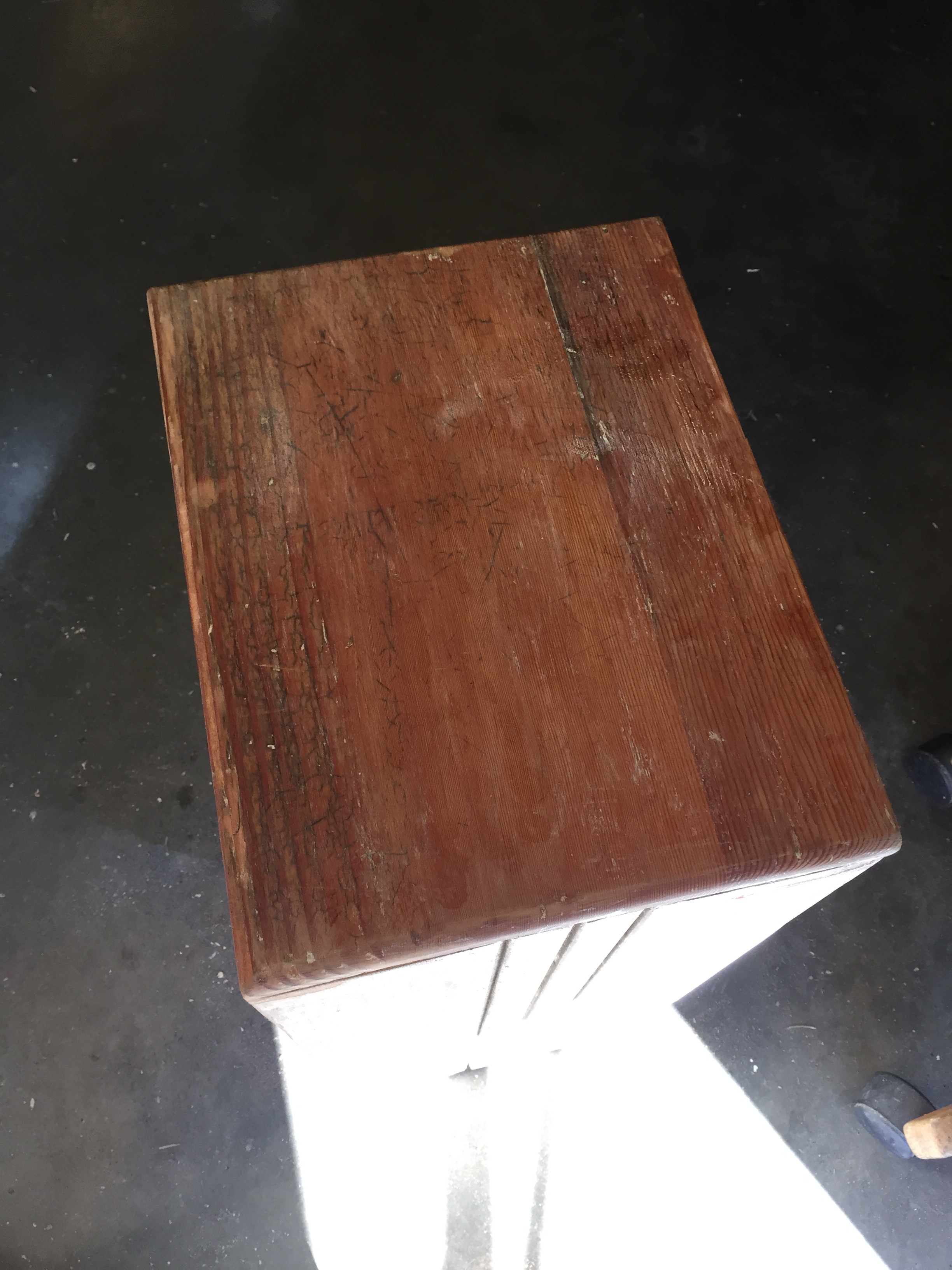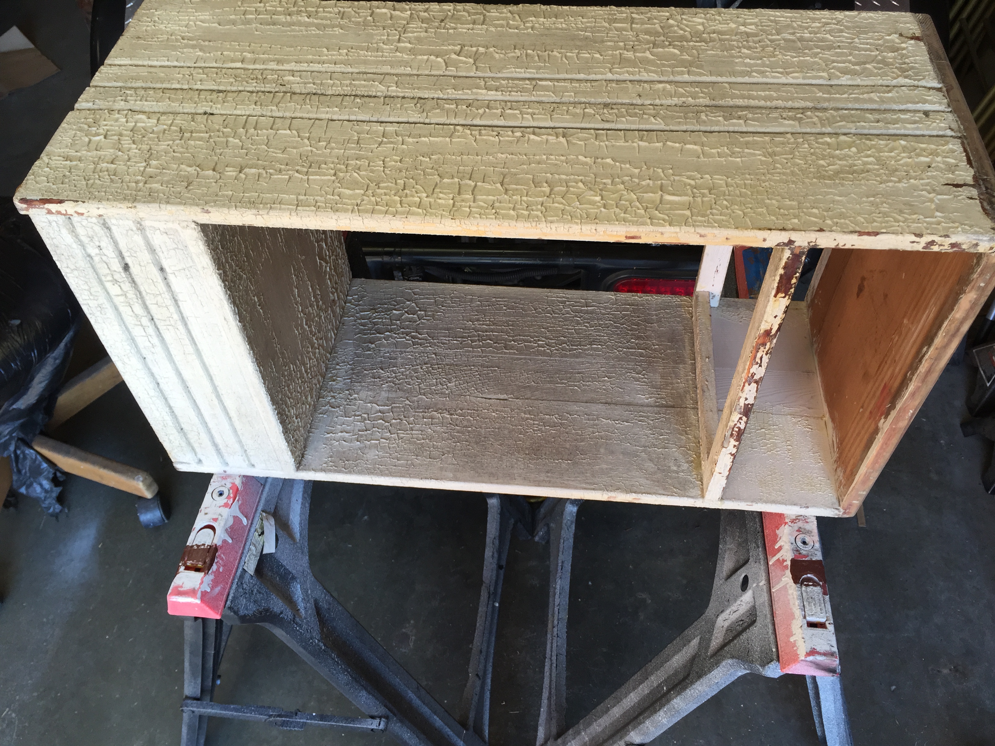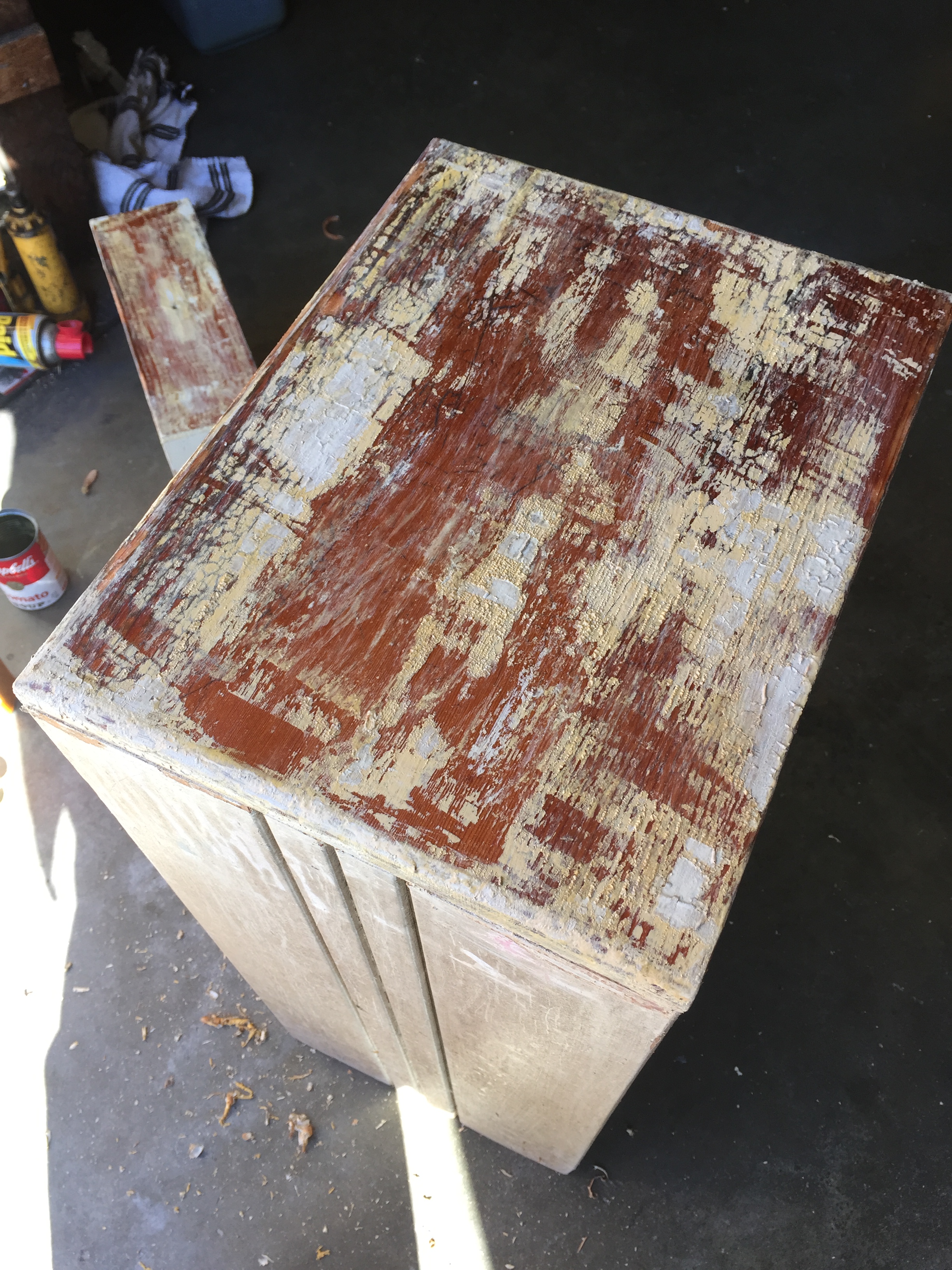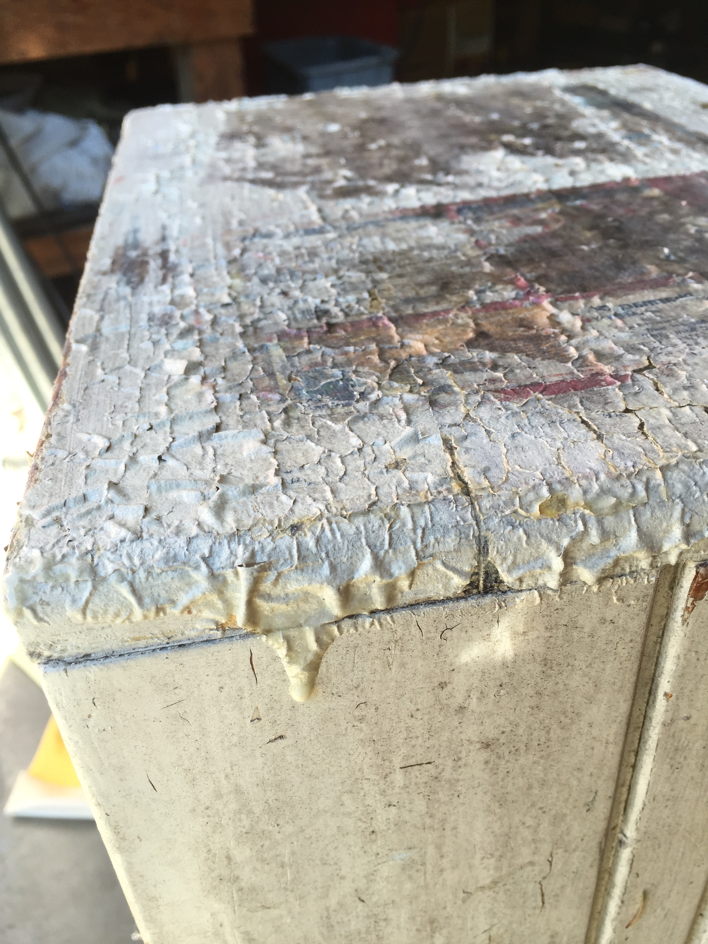 The first step in this restoration project is to scrape off anything that you can get off. In this case, there were a couple old stickers stuck to the top that needed to come off. Followed by any chipped or cracking paint. Which was pretty much the entire piece.