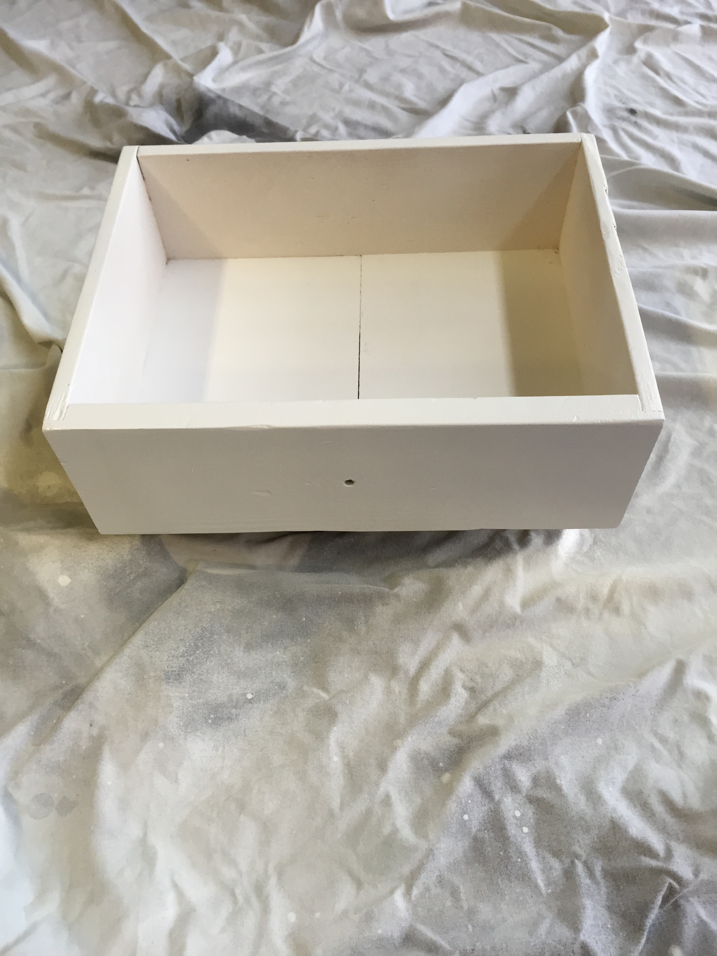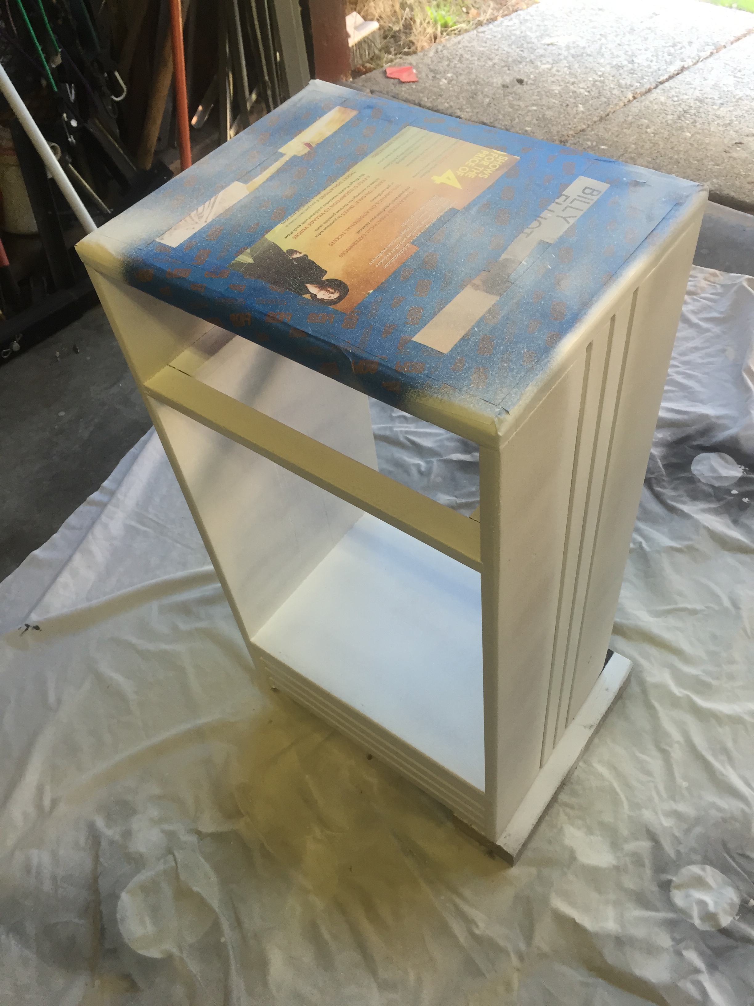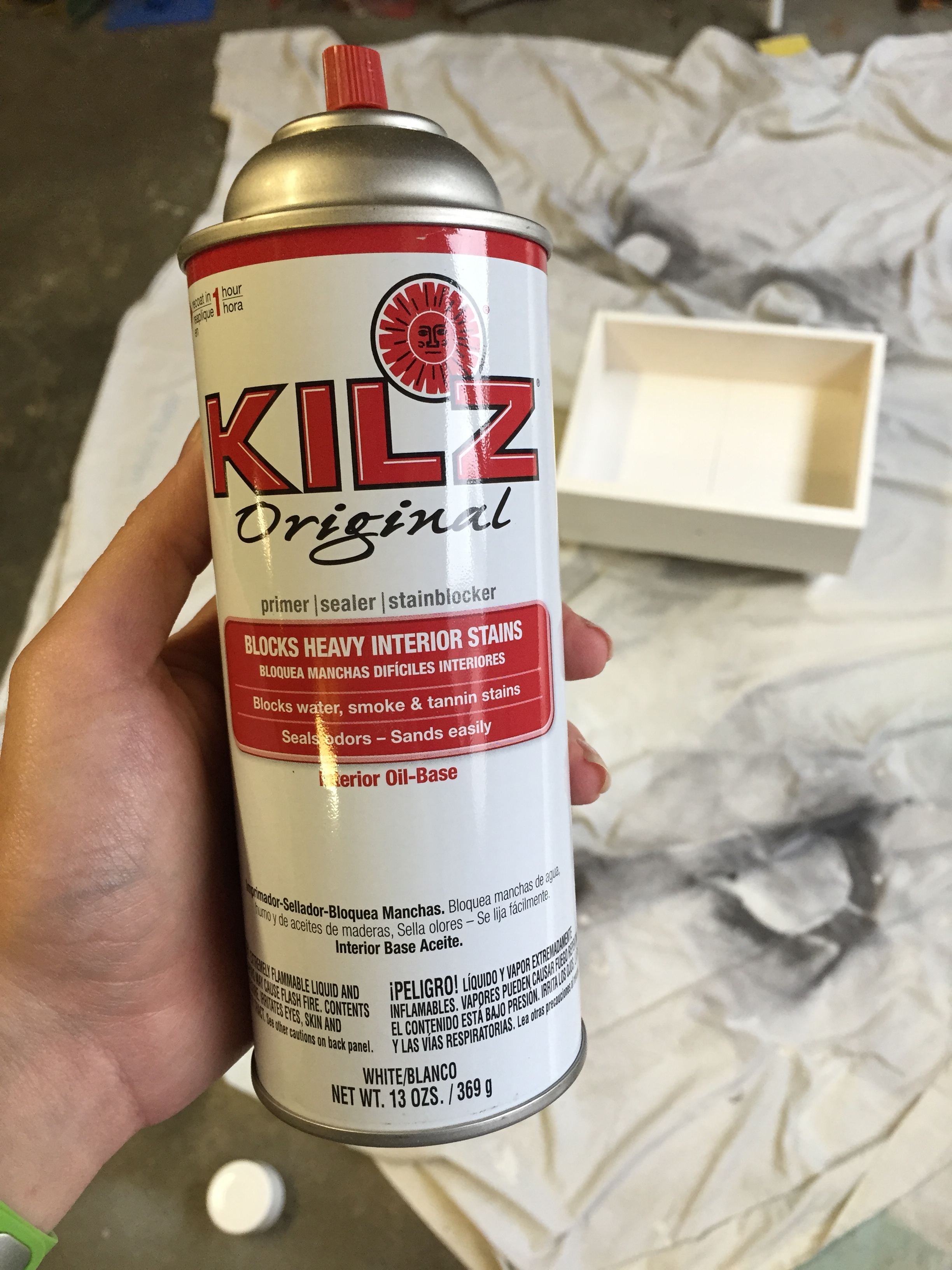 Next, It’s time for my favorite primer. KILLZ! But we want to protect the beautiful stain we just did. So tape it off, and/or use a waxy paper like an add. Then spray a coat over the entire nightstand. Including the drawer.