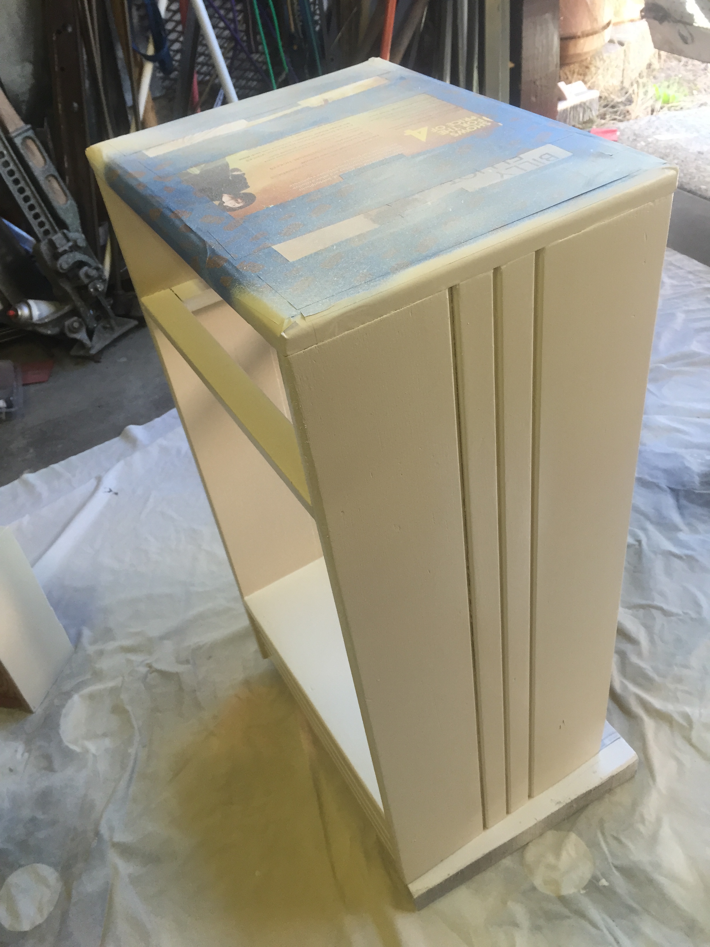 Now it’s time to stain! Since I only want to stain the top, I taped off the sides with painter’s tape. The stain I used is extremely old, and of course…I found it in the depths of the garage. The color’s name is “Dark Oak.” When staining wood, you want to use an old cloth and apply it in long strokes WITH the grain of the wood. Put down an entire first coat, then wipe the excess away with a DIFFERENT cloth.