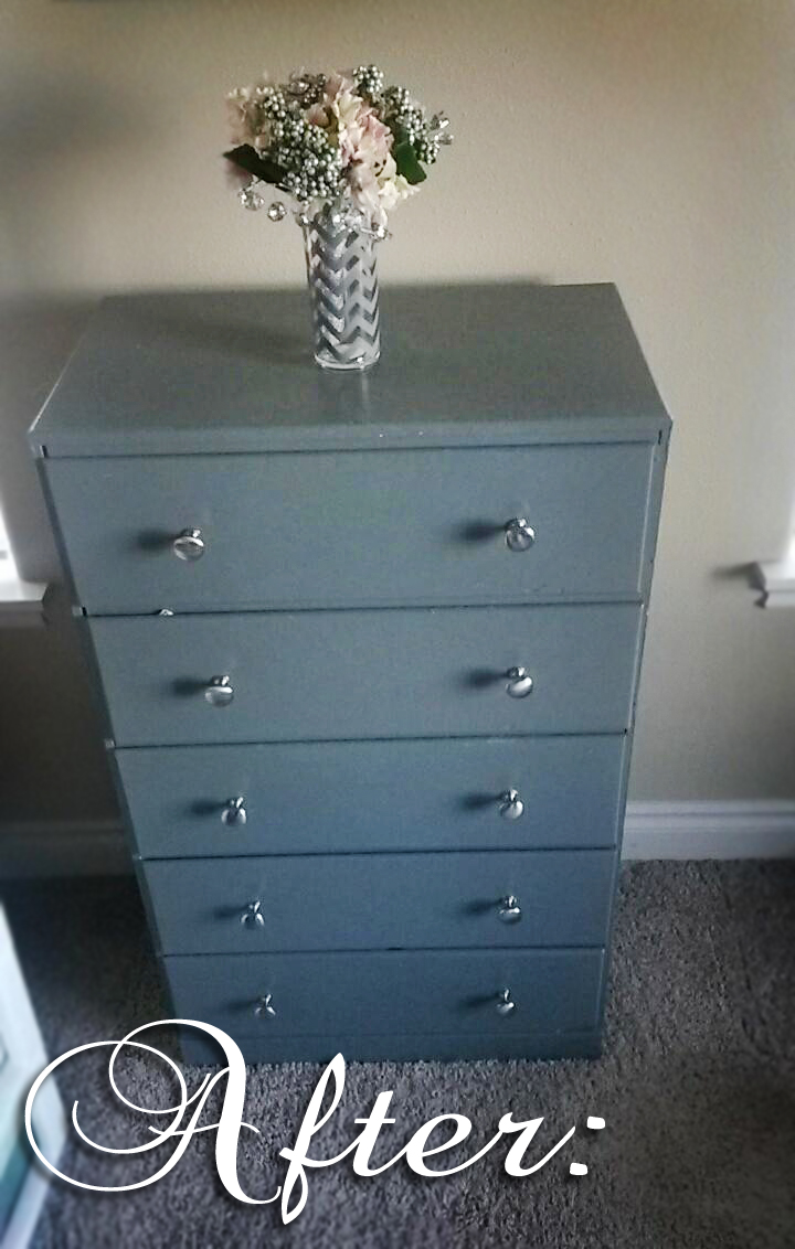 Today I have the pleasure of sharing a project that was completed by one of my great friends! Kaitee took this children’s style dresser and gave it a new life! Now this dresser, which may have never received a second glance, is now a stunning pice! It’s amazing to me that some paint and beautiful knobs can turn an old item into something that any adult would love to display in their home. And I don’t know if you feel the way I do….but, there aren’t many things I hate more than feeling childish.