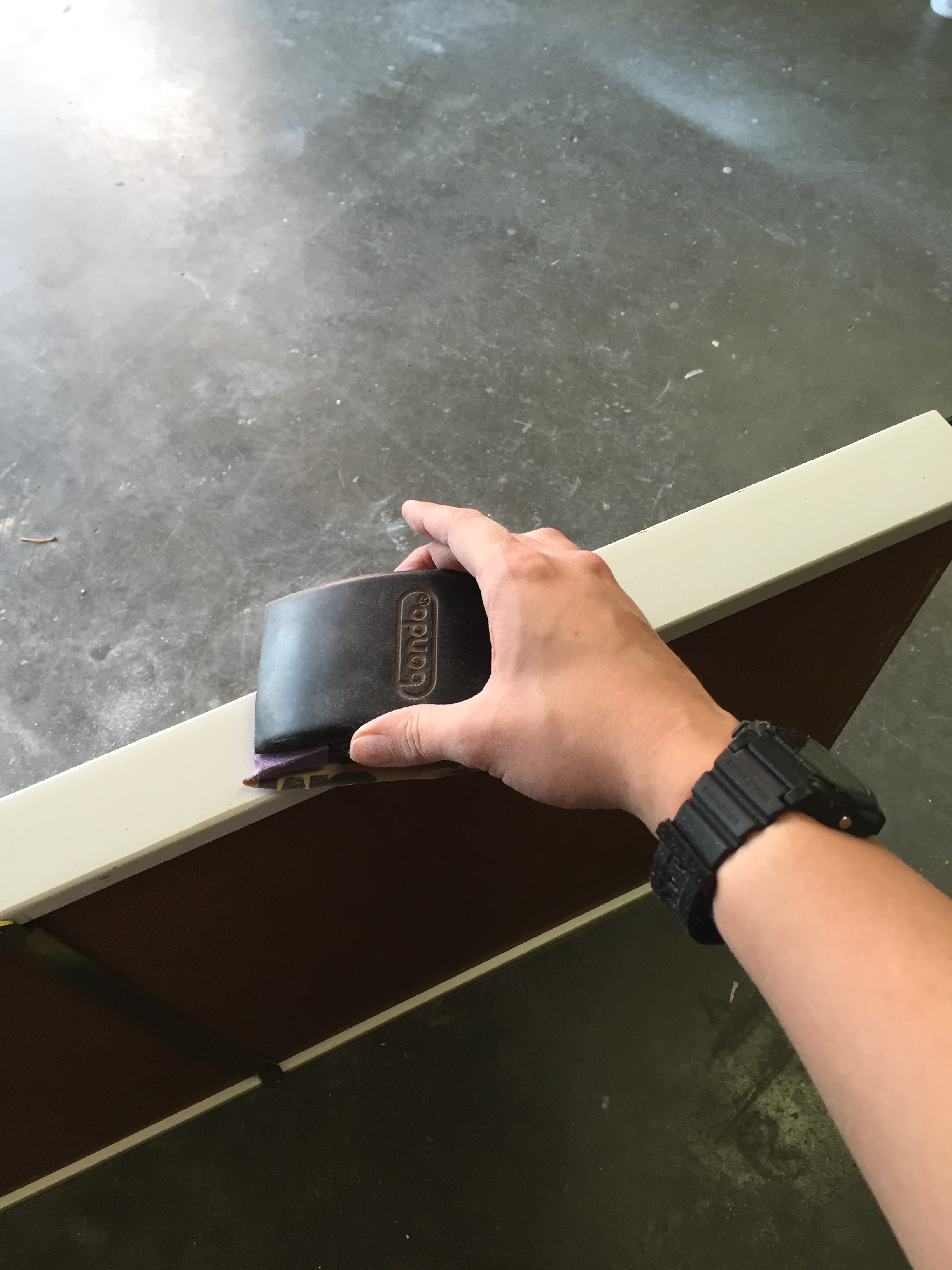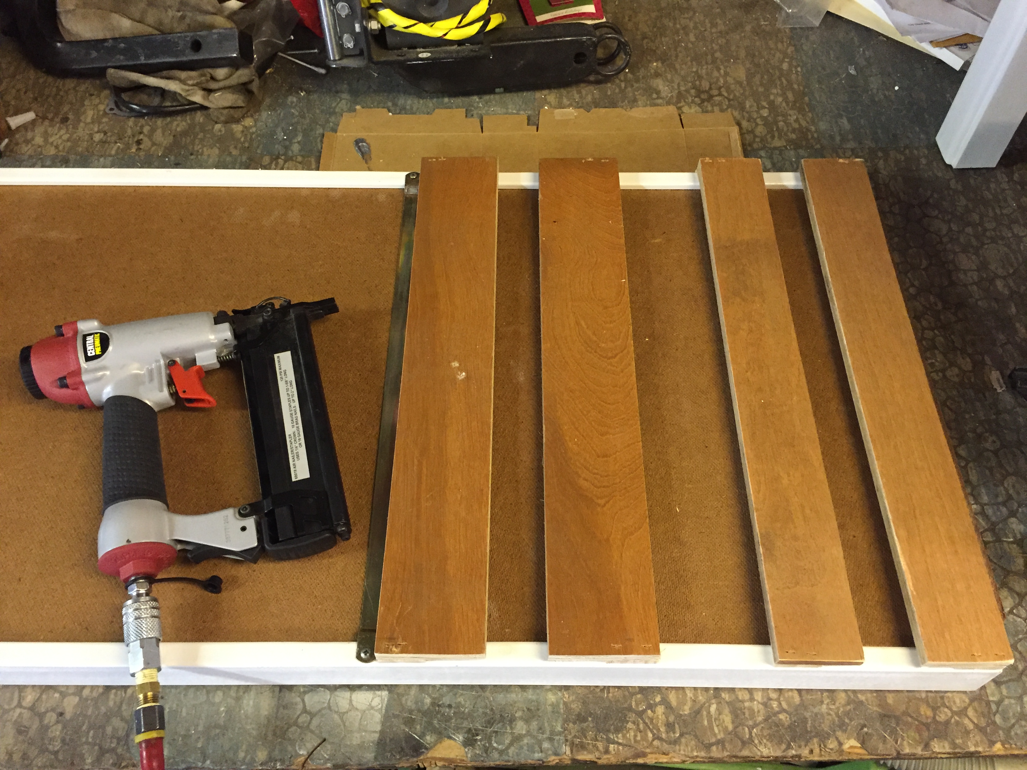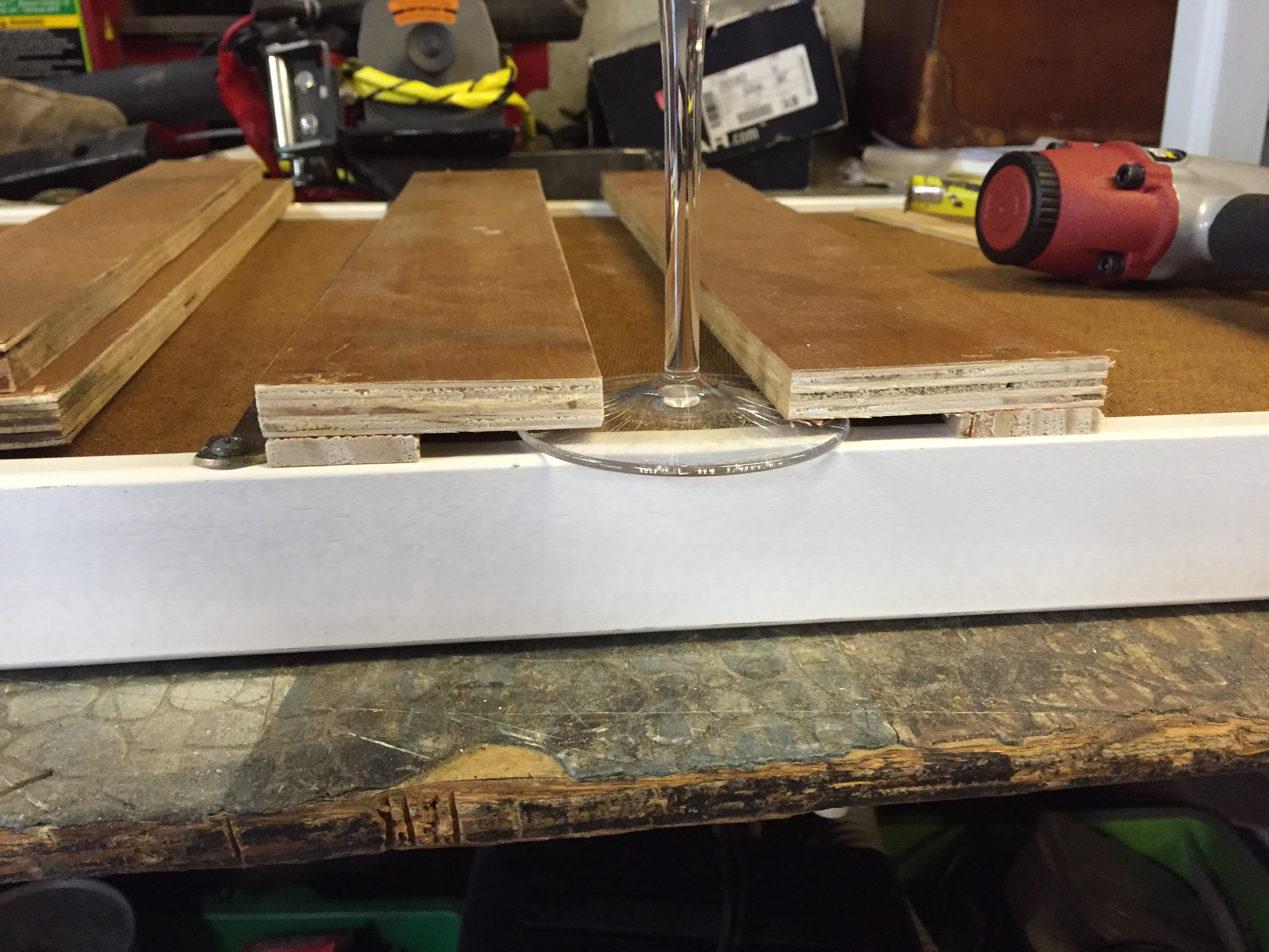 Place a piece of stir stick under each floor board, as seen above. Allow for enough room for one of your glasses to slide in and out smoothly. Then, use a nail gun to secure them into place. I used 1.5 inch nails, with the air compressor set to 60. I put two nails in each strip, making sure to allow room for the bottom board of the shelf to slide in and out, as it is supposed to.