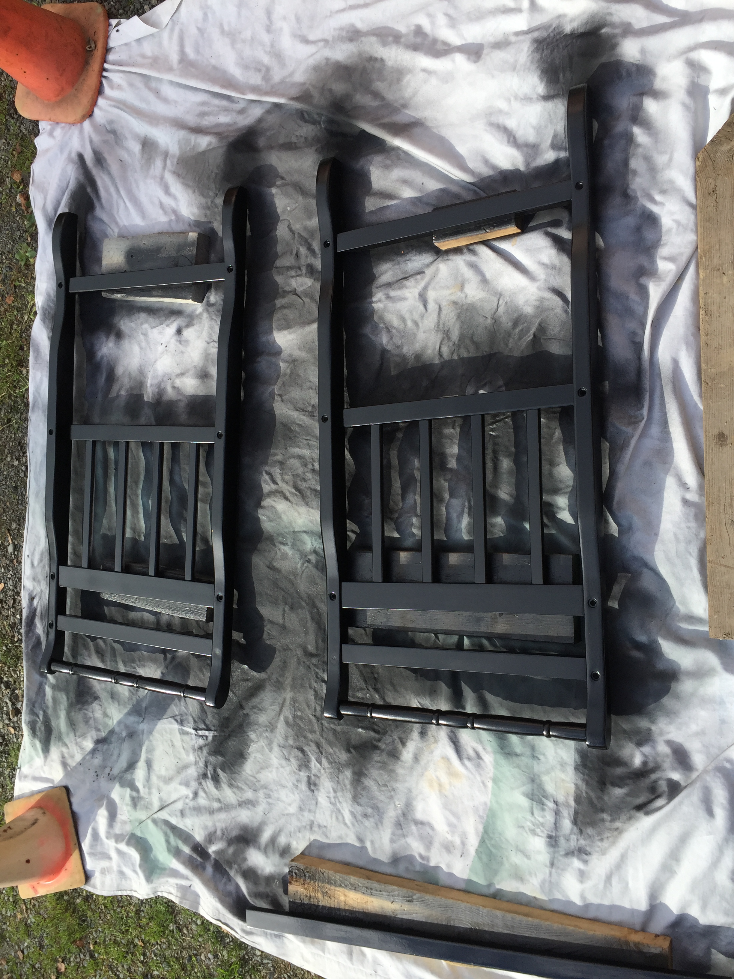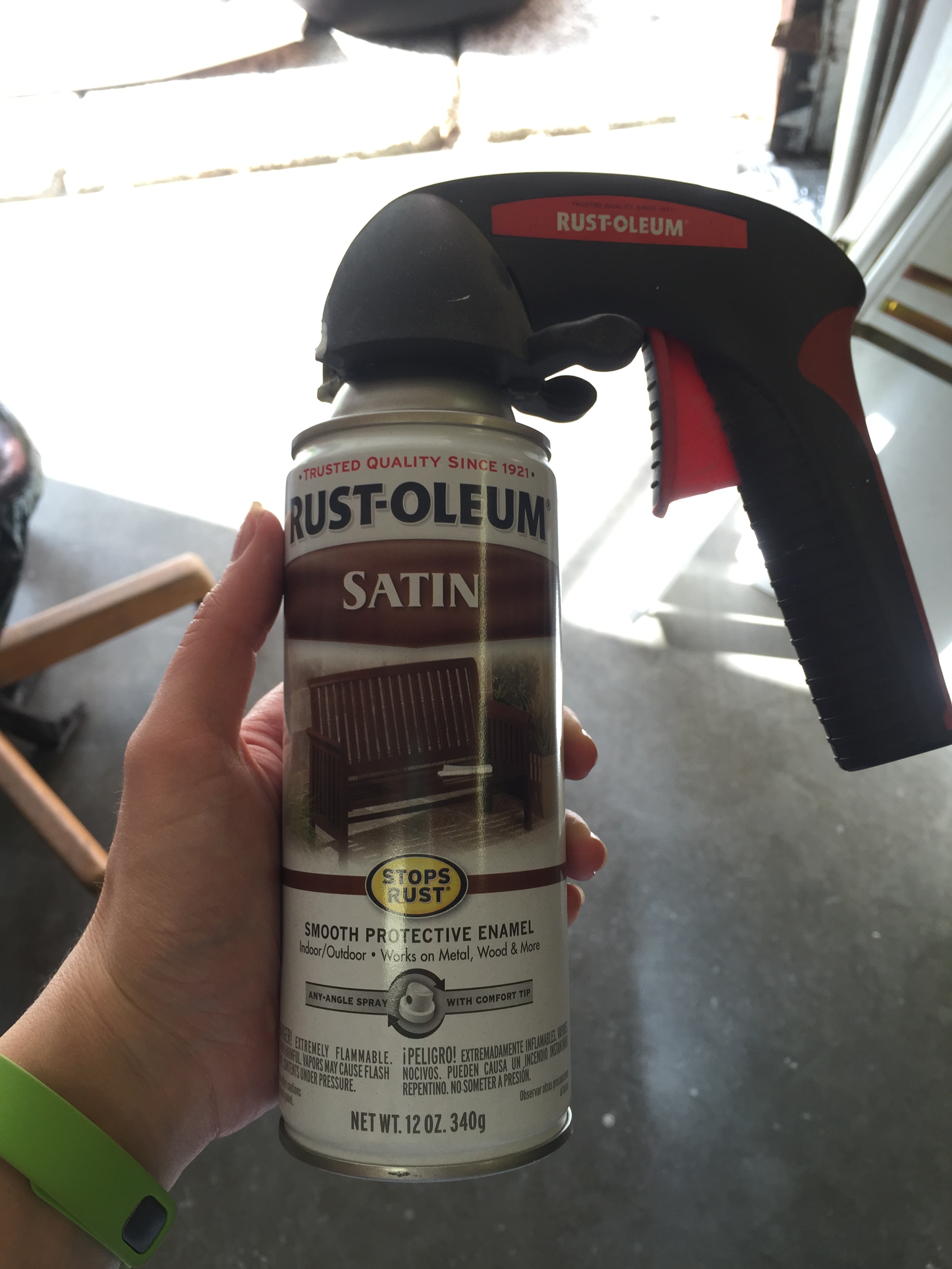 Next, you can start painting the pieces of the changing table. I chose to use the satin spray paint seen above, in the color black. This I found as Home Depot for $3.79 and I ended up needing about 2 and a half cans for the entire project. So, try to get that all at once….instead of three trips like I did. If you buy too much, you can always return any unused cans. I painted every piece of the changing table this color EXCEPT the bottom of the shelves.