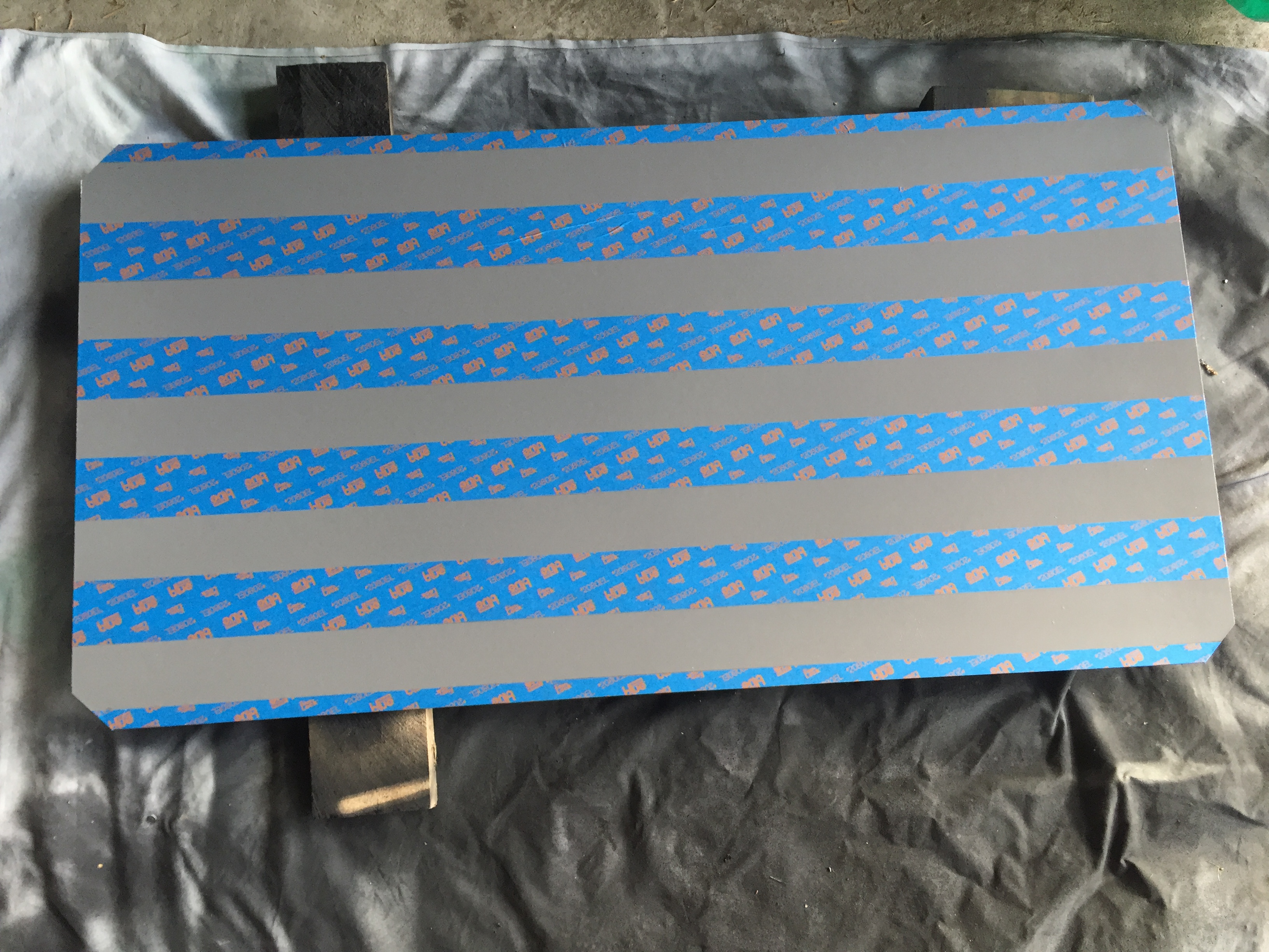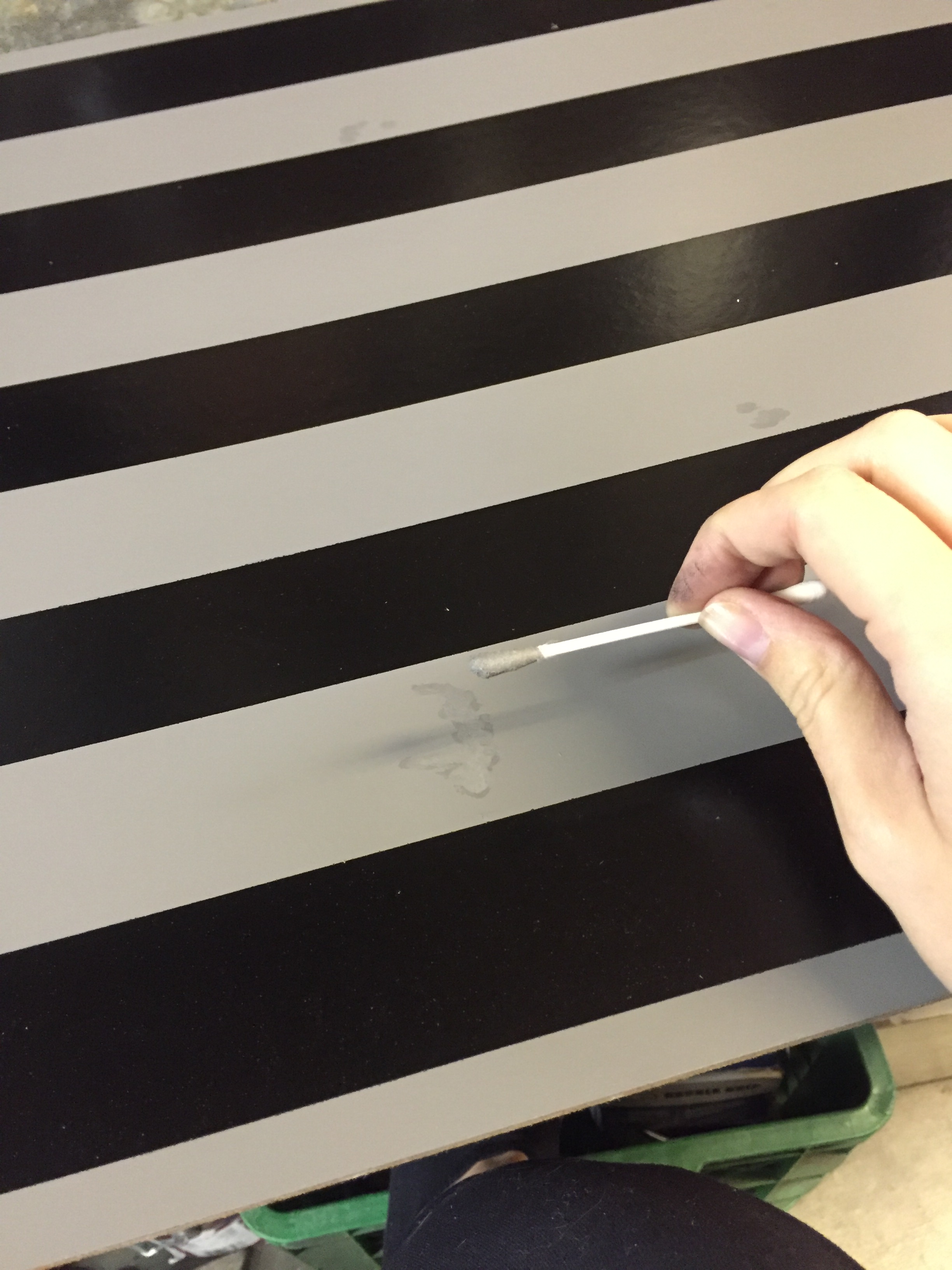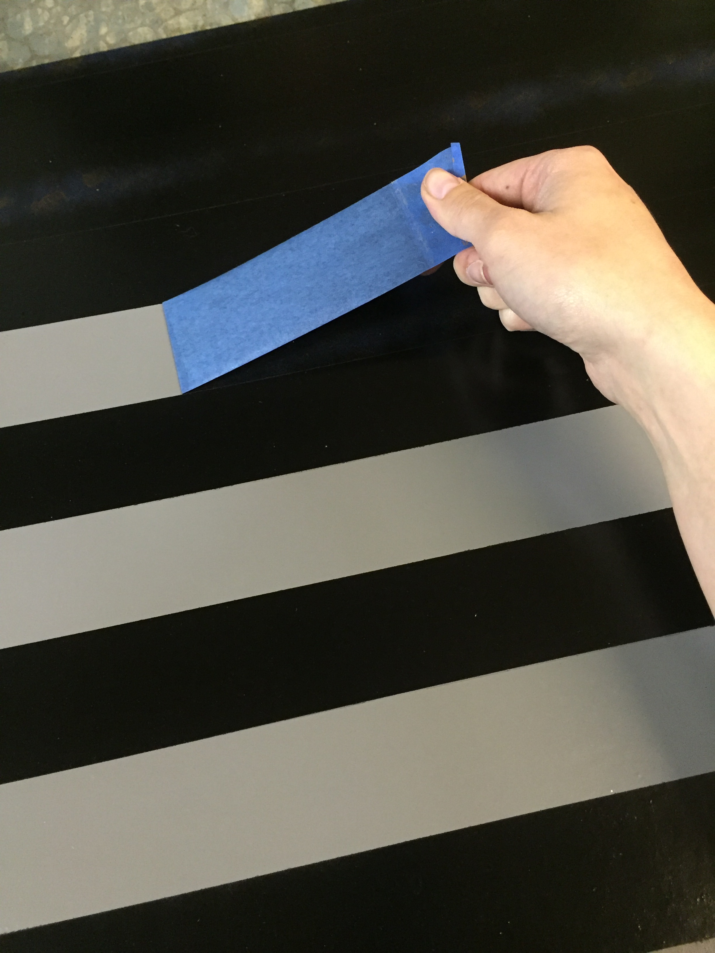 Once your tape or stencil is secure, you can paint over it with the first color. In this case, black. After the new paint has completely dried, remove the tape very slowly. And If any of the grey paint is ripped off in the process, just spray some more paint onto a paper plate, and use a Q-tip to patch the paint. And it’s perfect again! (Do a couple coats on the patch.)