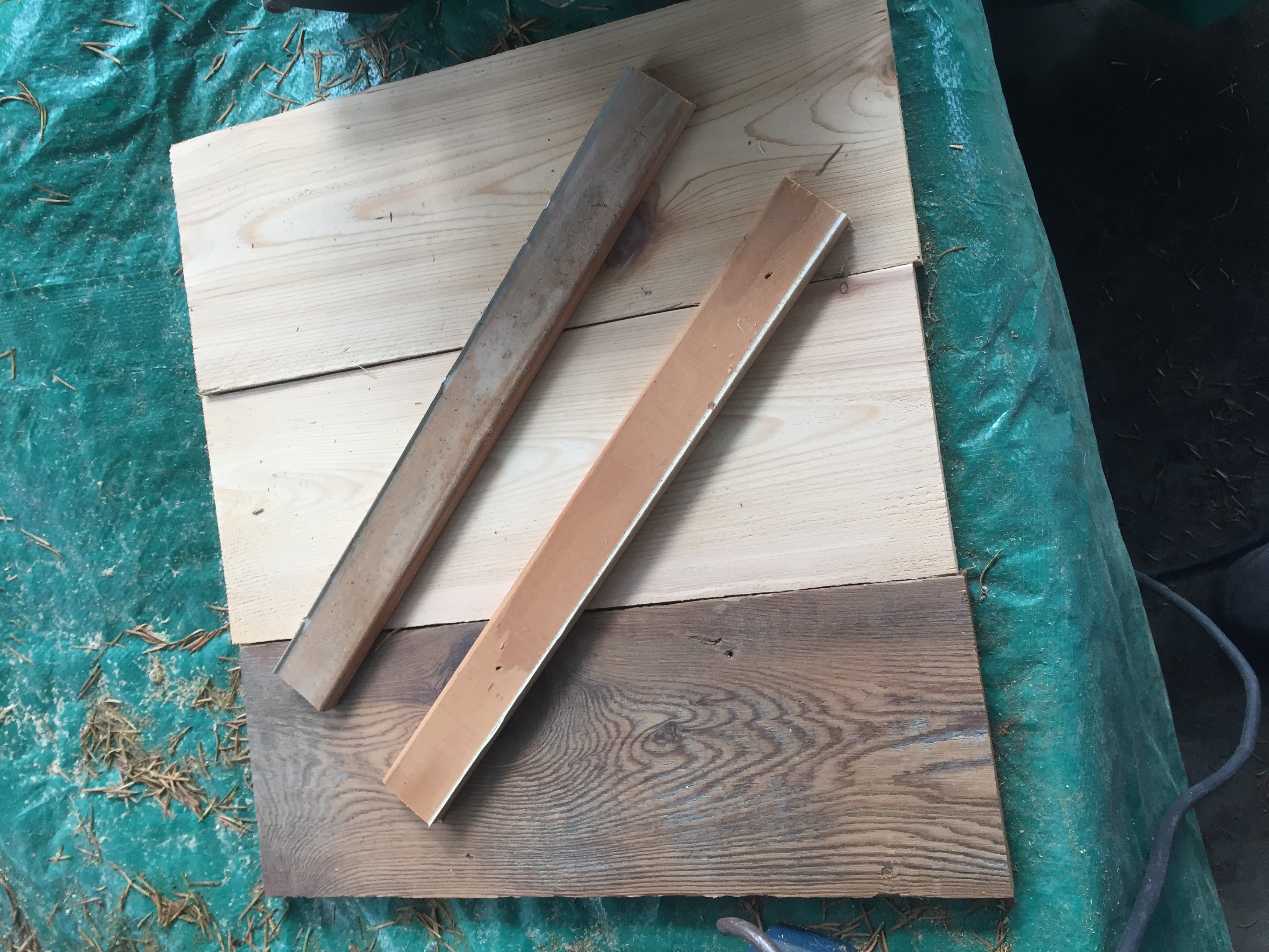 For this project, I used the last few pieces of fence wood from my dad’s wood pile. One which was considerably older than the others. For measurements, I just used the length of the smallest piece, and cut the others to match. I also picked out two small pieces of old wood trim form my parents remodel, and cut them to match. These will be what secures the three larger boards together.