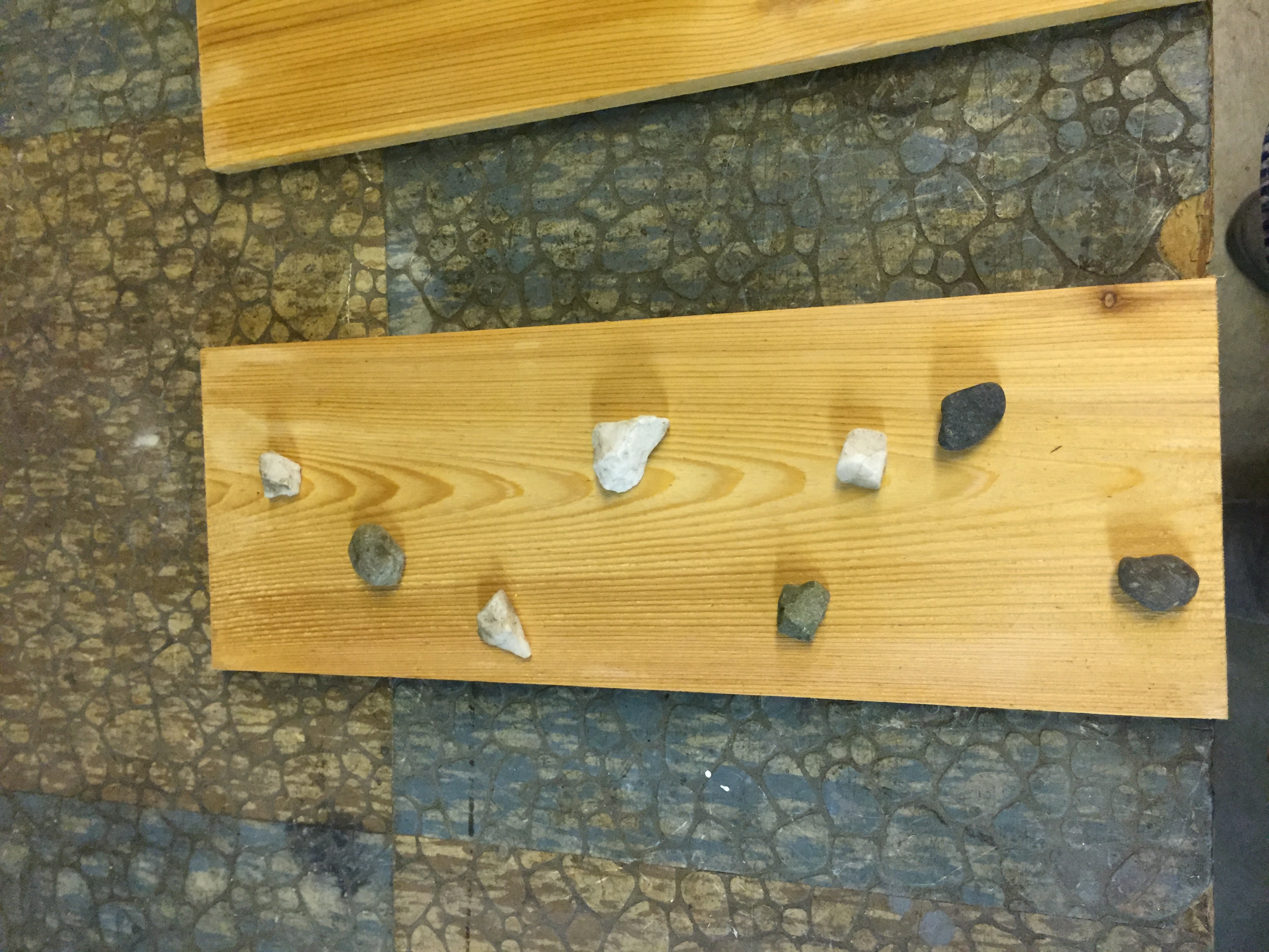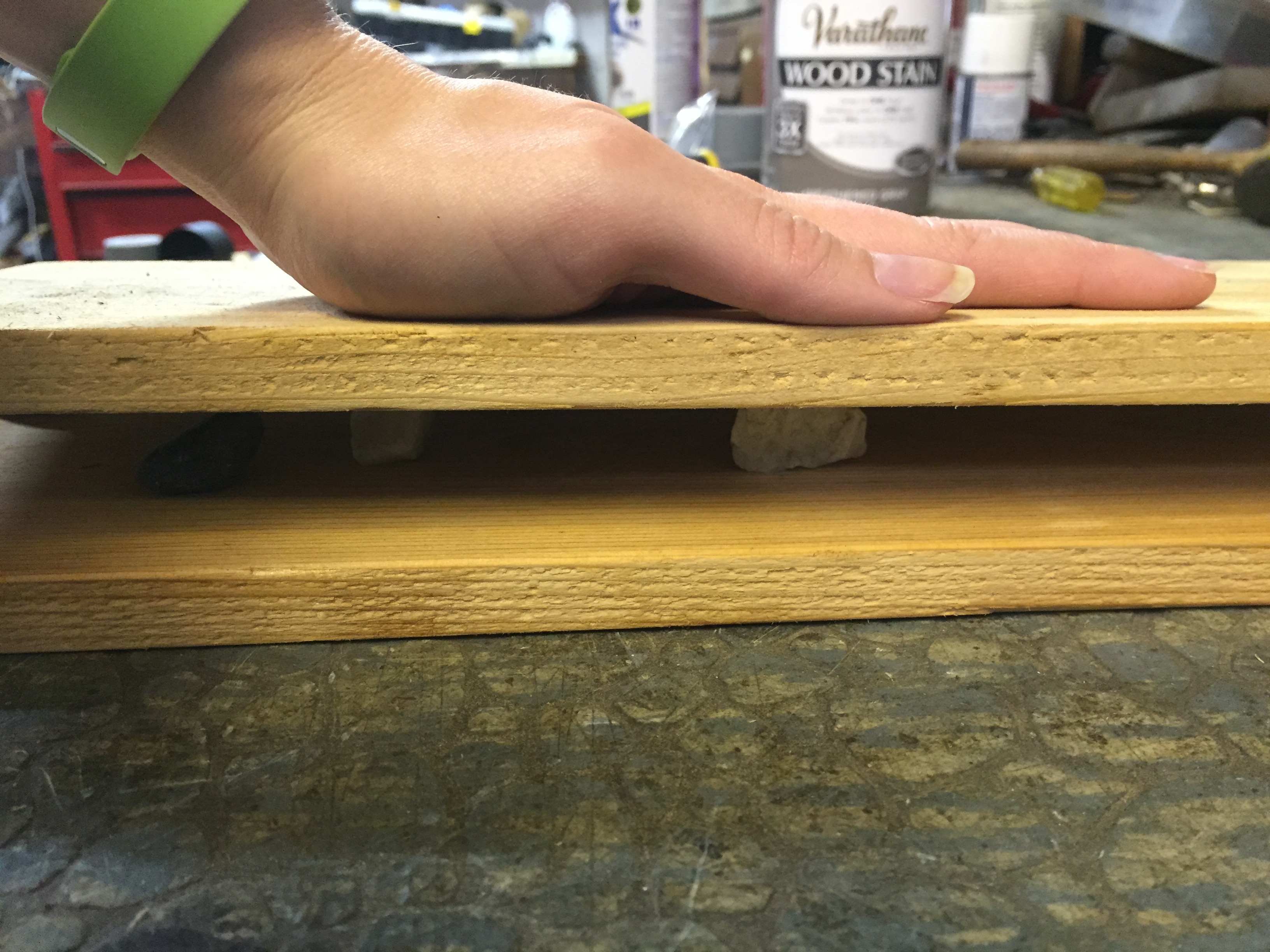 After cleaning up the wood, I decided that I wanted the wood to look a bit more weathered. The newer pieces just looked too new compared to the older one. In order to distress the wood, I placed some rocks between the two boards, applied pressure and moved the boards in circles. This creates some scratches and dents in the wood, which will give it an imperfect look.