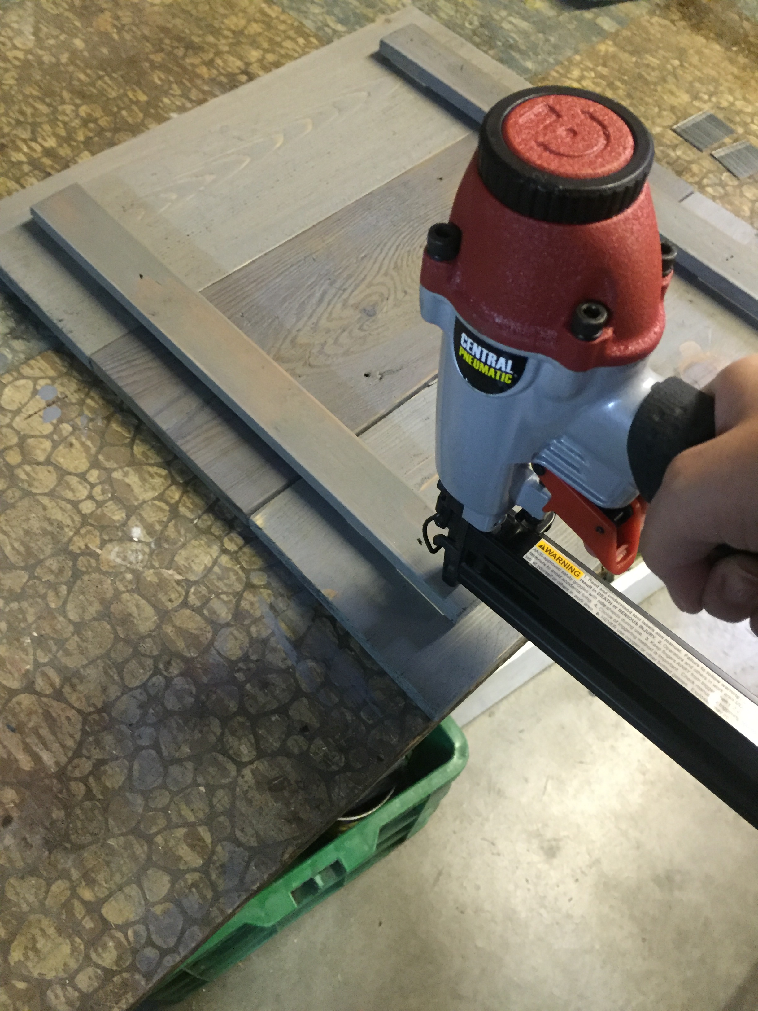 Next, it’s time to secure your pieces of wood together! I used an air compressed nail gun with one inch nails. The only issue I came across, was that the one inch nails were actually too long. In order to keep the nails from going through to the front of the sign, I needed thicker wood. So, I put a pieces of paint stir stick between the two pieces of wood, on both ends. This was all the extra thickness I needed. Then I applied two nails per board, on each side. (12 nails total)