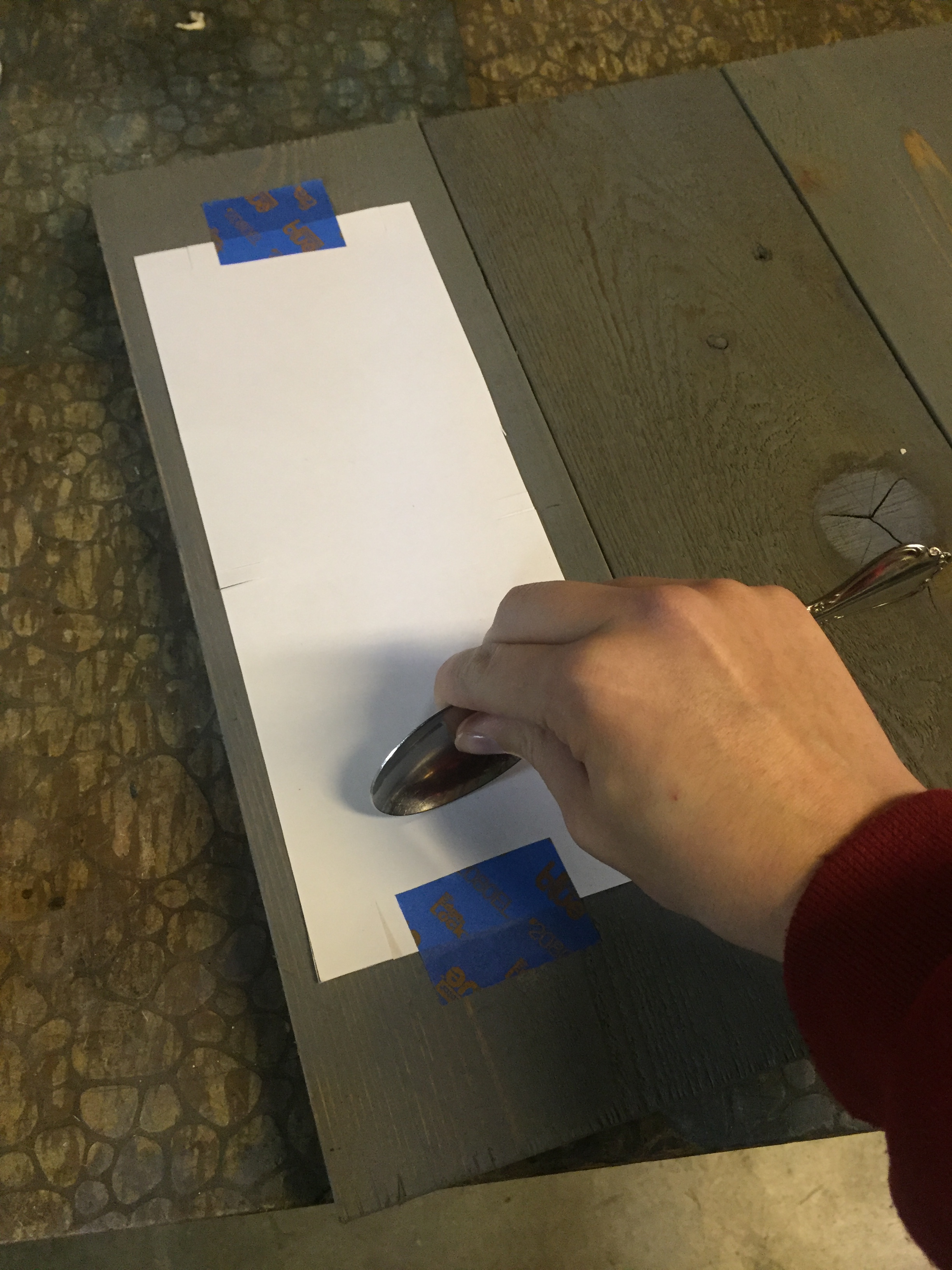 Once you’ve printed your words as a flipped image, tape them into place. Make sure to do this carefully because the ink will smear! Then use the edge of a spoon to rub the ink onto the wood. You’ll need to apply a lot of pressure when you rub. After, it should look like the picture on the right.