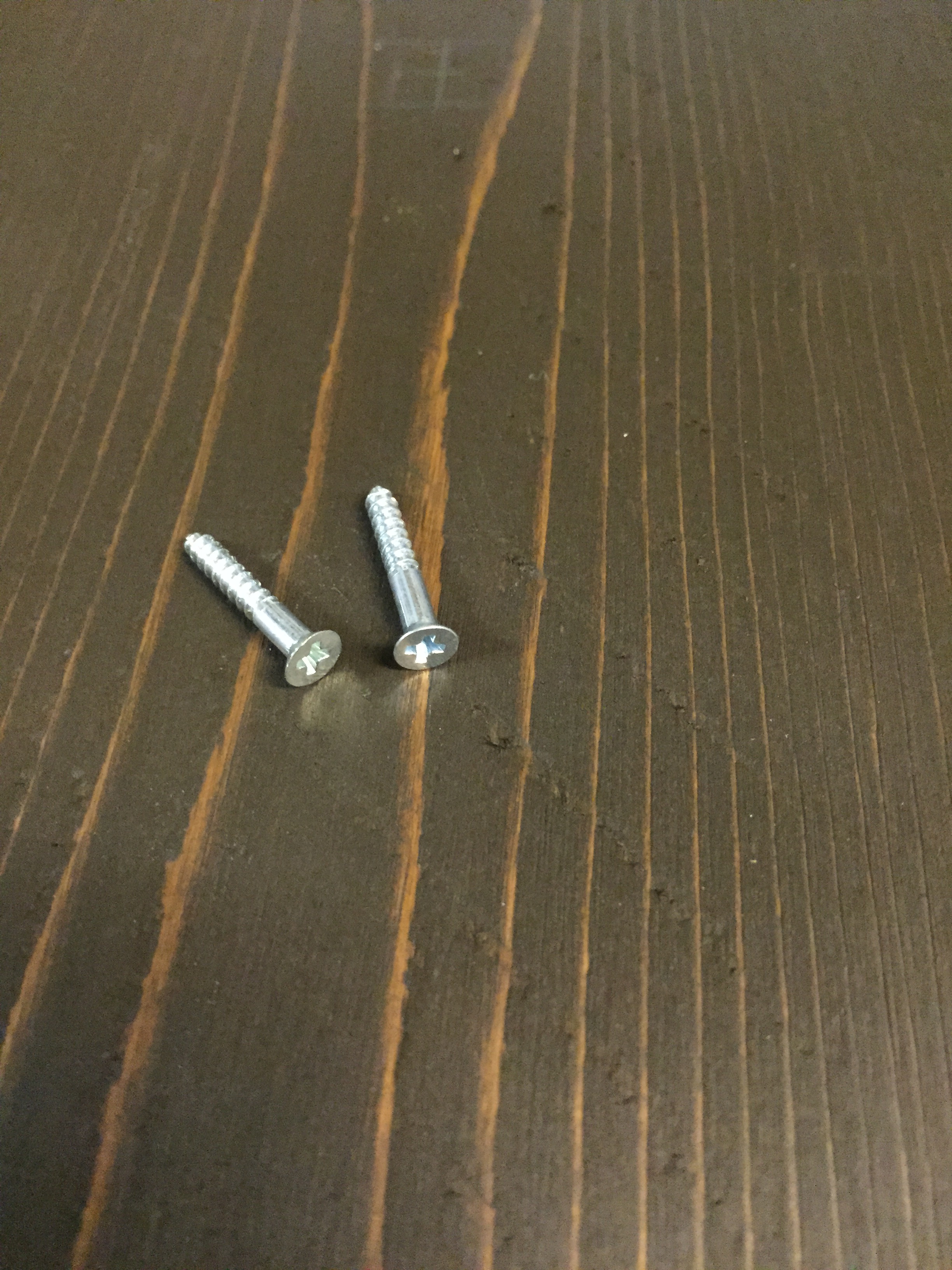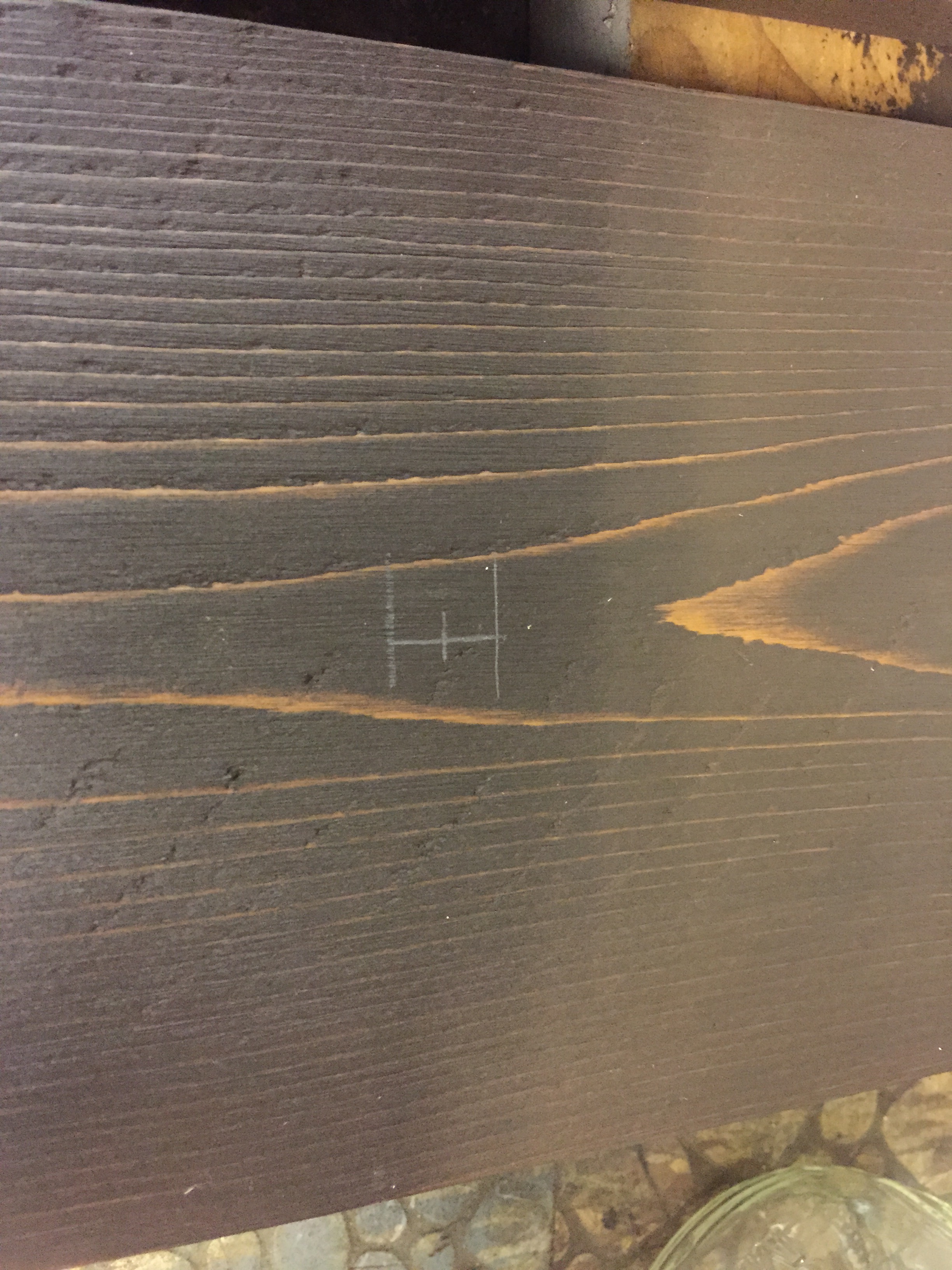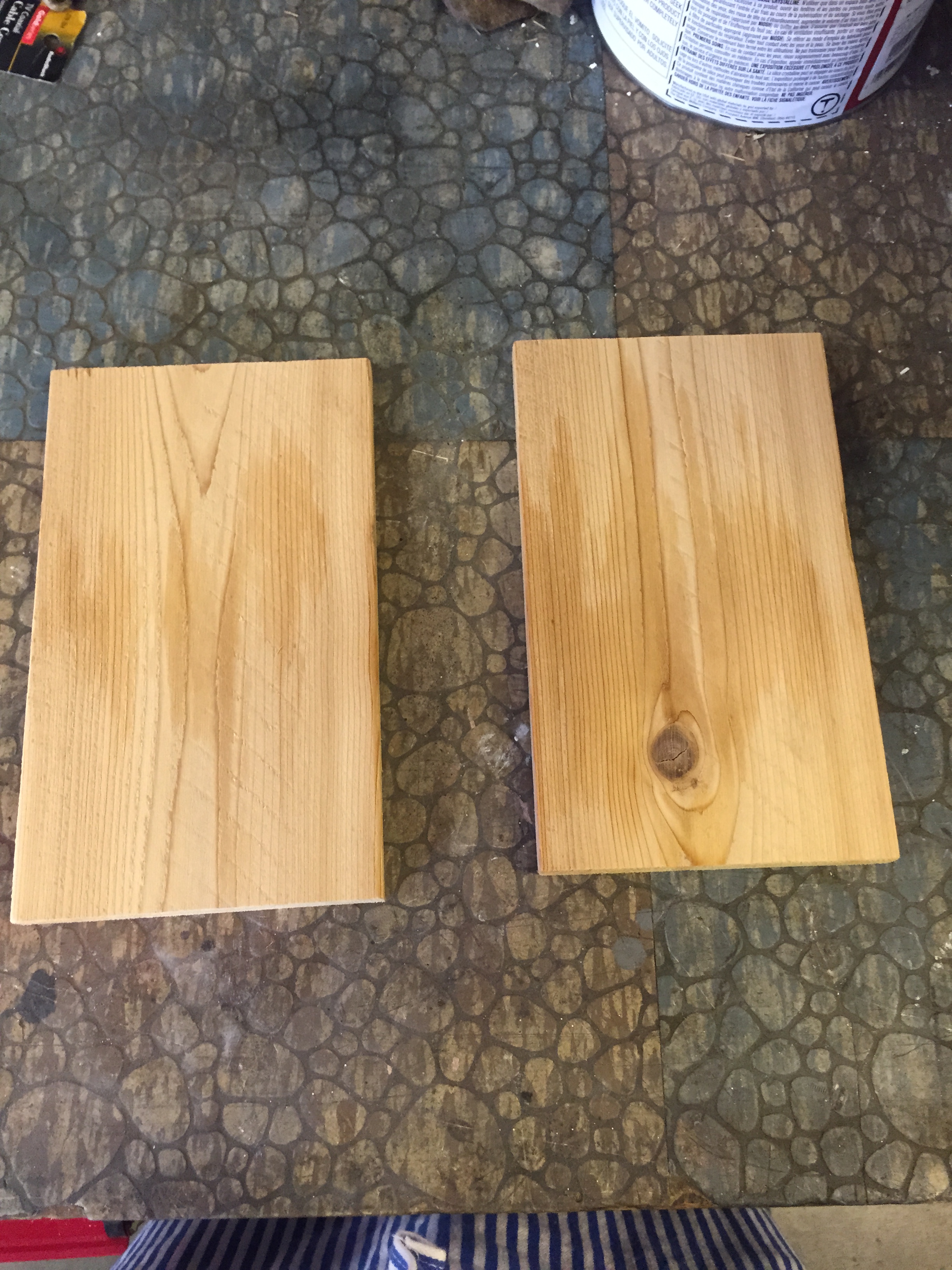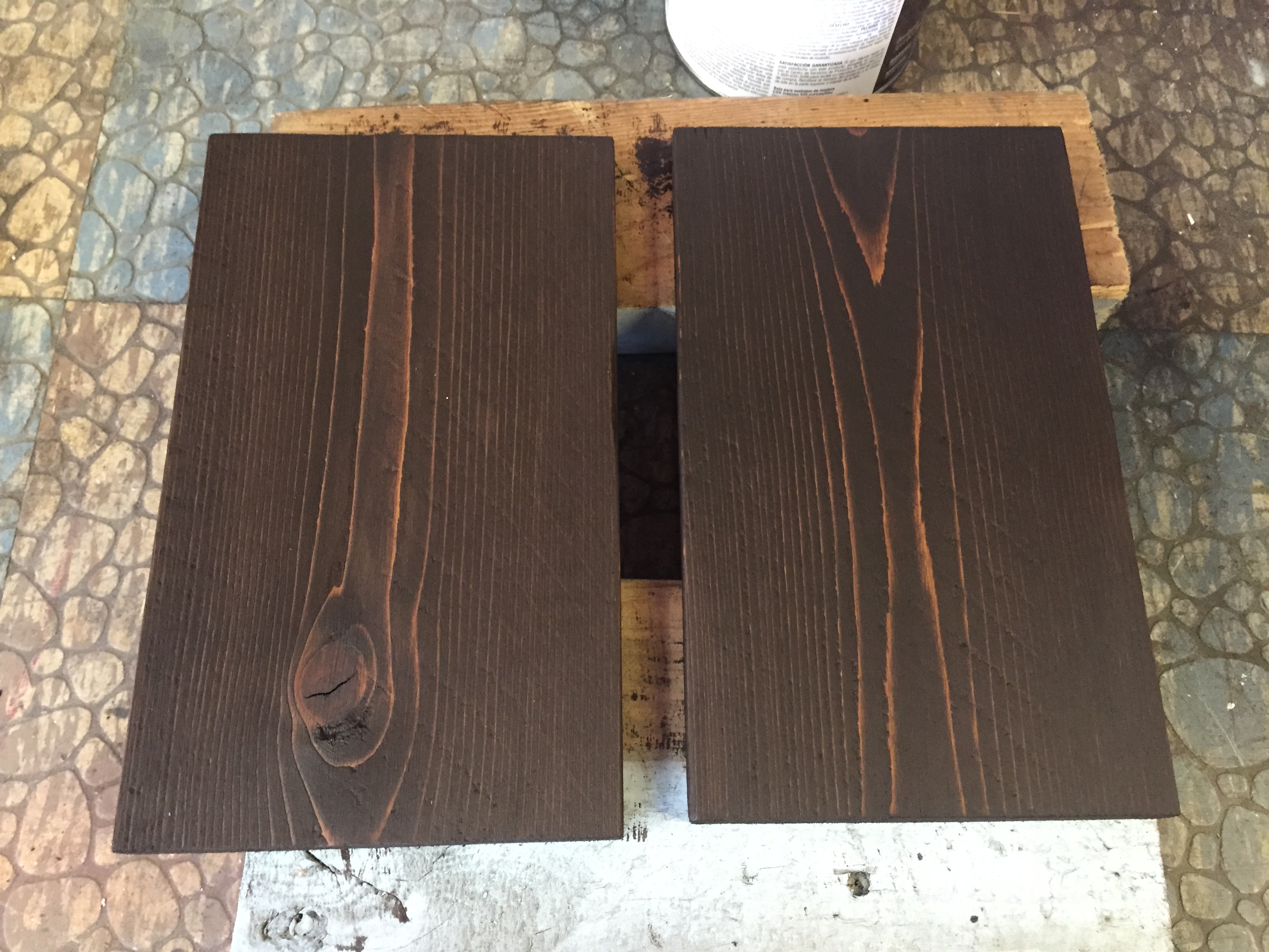 Once your pieces of wood have been sanded and cut to the right size, give them a wipe down with a damp clean cloth to remove any and all dust. When they’re dry, it’s time to pick out a stain. I went with this dark stain found in the deep abyss that is my dad’s garage. Using an old CLEAN rag, rub the stain on the wood in the direction of the grain. AKA: the stripes. Then immediately wipe the wood again with another dry CLEAN rag to remove the excess stain. Rub extra in places that you want to be lighter. If you decide you want it to be darker, you can add another layer of stain.