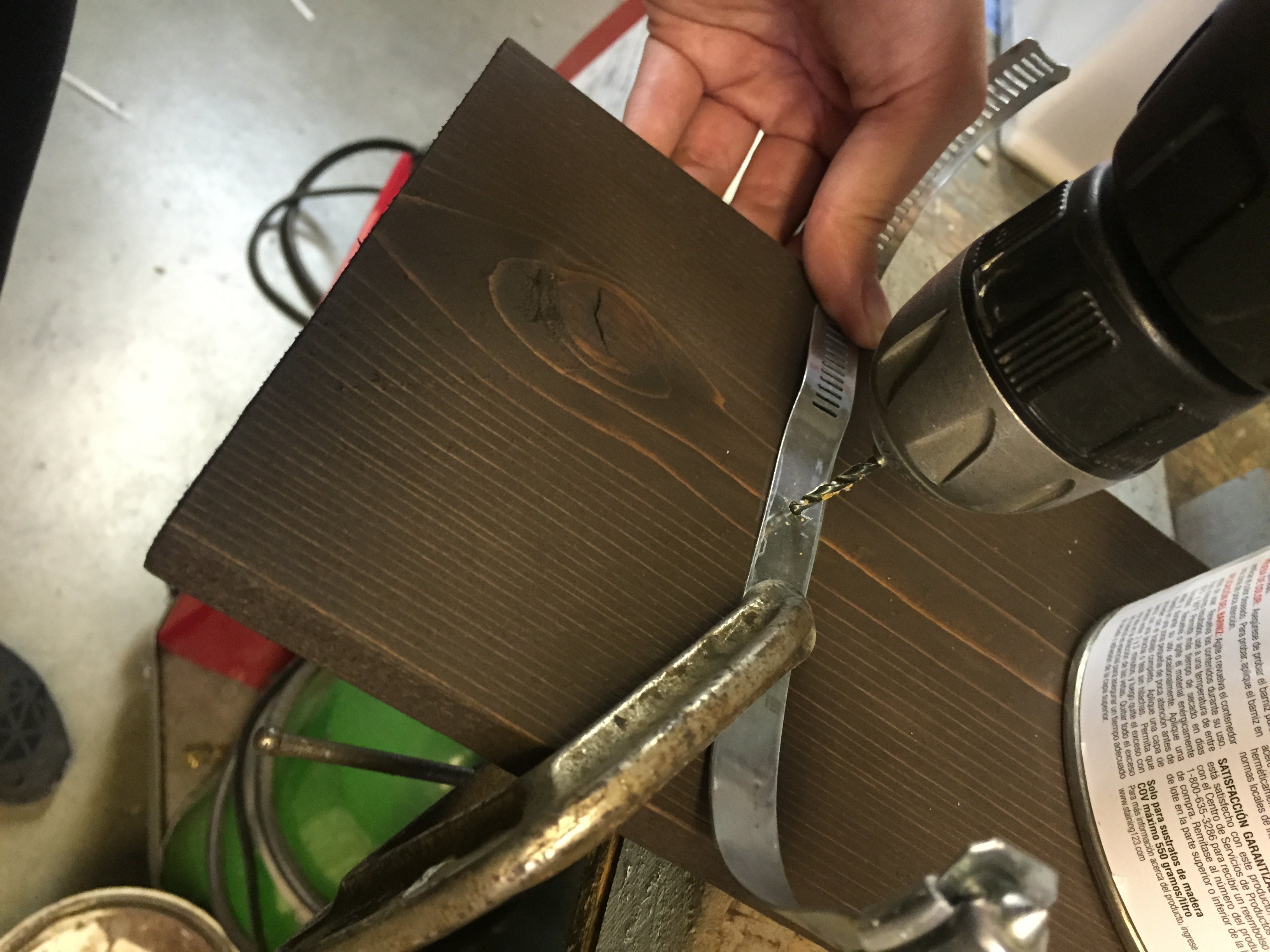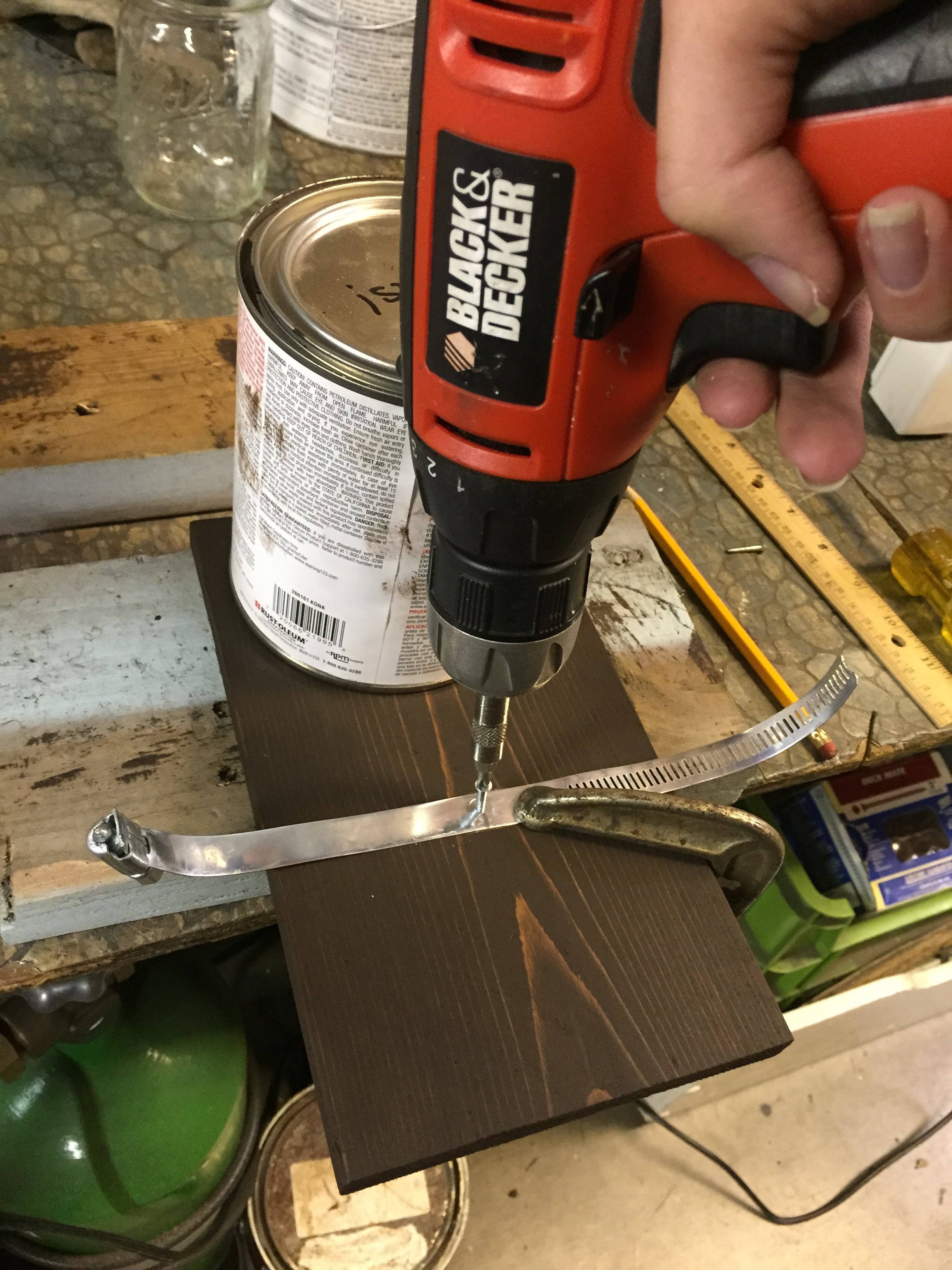 Your next step is to drill a hole to connect the Hose Clamp to the wood. This is what will be holding your mason jars in place. So make sure to measure for the center and the height you want the jars to be hanging from. Then use a drill bit the same size as the screws you are using. You can see the ones I used on the next step. Use a clamp or vice grip to make sure the metal hose clamp stays exactly where you want it to stay. Then drill through the metal and wood at one time.