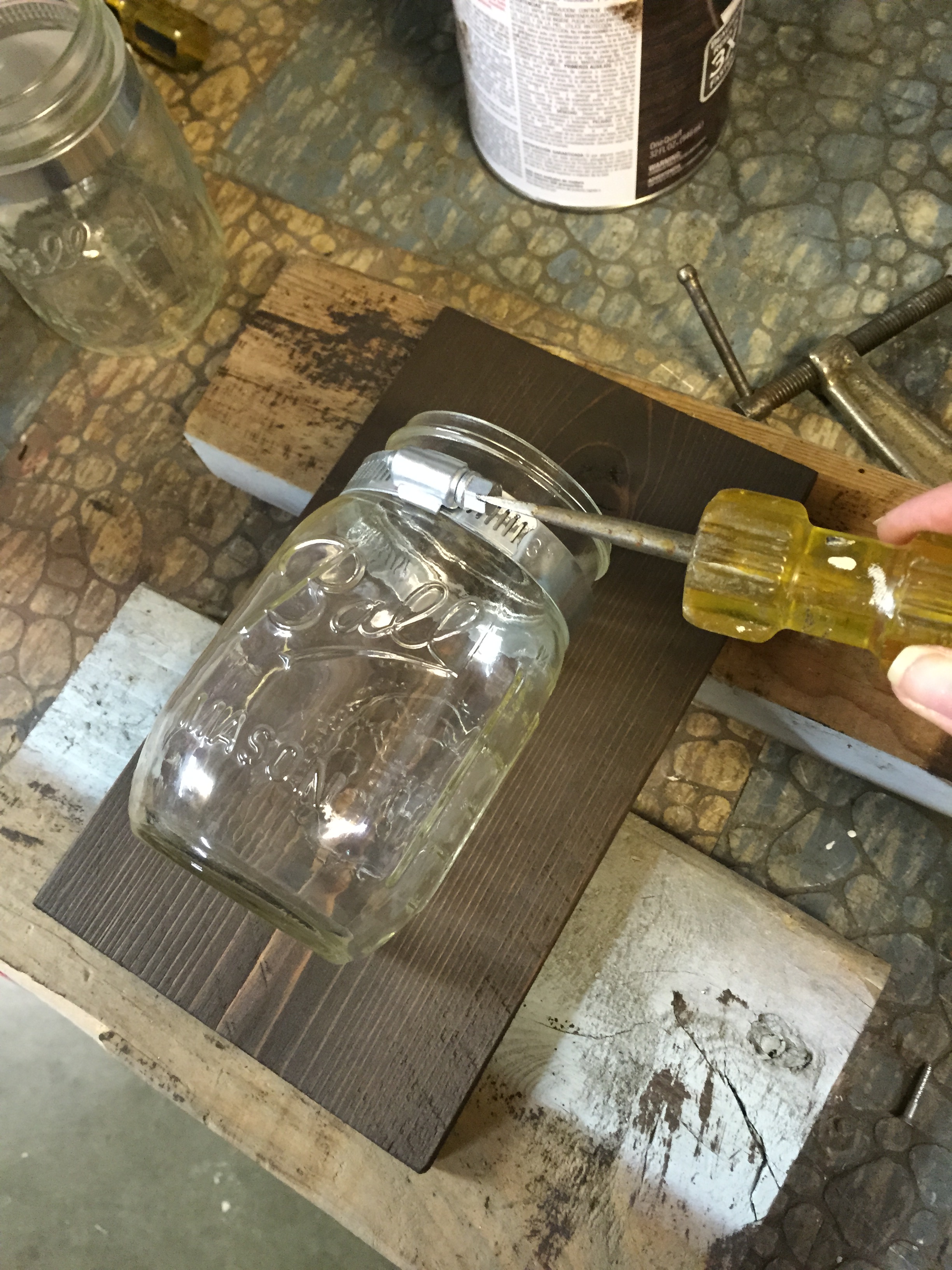 After your holes are drilled, your next step is to screw the hose clamps into place. The screws I found in my dad’s drawer of a million types of screws, is seen above. Make sure you chose a screw with a flat surface. This way it won’t get in the way of the hose clamp’s job. Which is to securely hold the jars in place. Once they’re nice and snug, bend the clamp around the neck of the jar and use a flat head screwdriver to tighten them. But make sure not to make them too tight… we don’t want to break the jars!